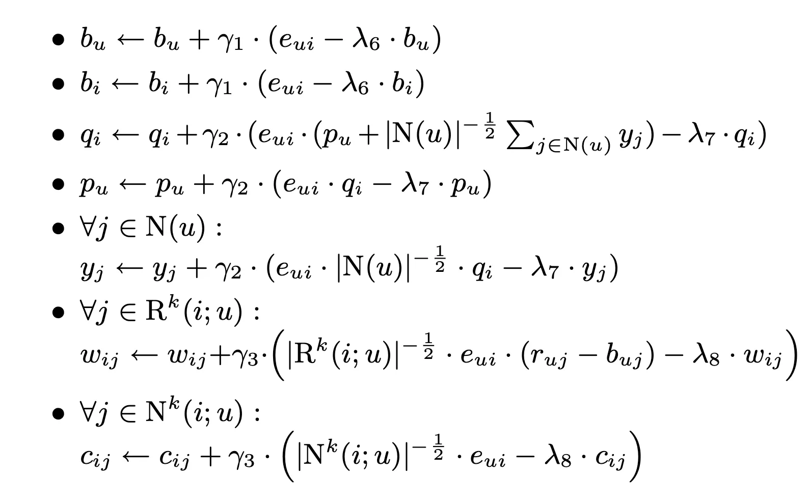 neighborhood 방법에서 userspecific한 유사도 찾기를 버리고 gradient descent를 통해 global한 관계 weight를 발견하고자 함.