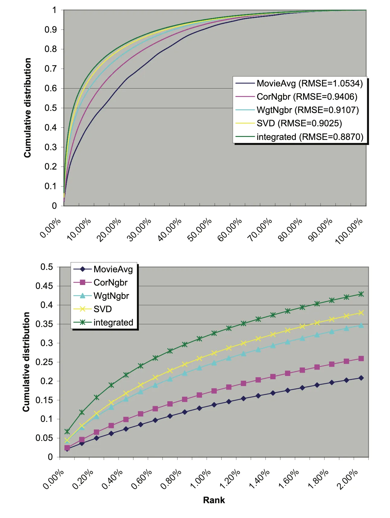 neighborhood 방식 + latent factor 방식을 결합해서 낮은 RMSE를 달성