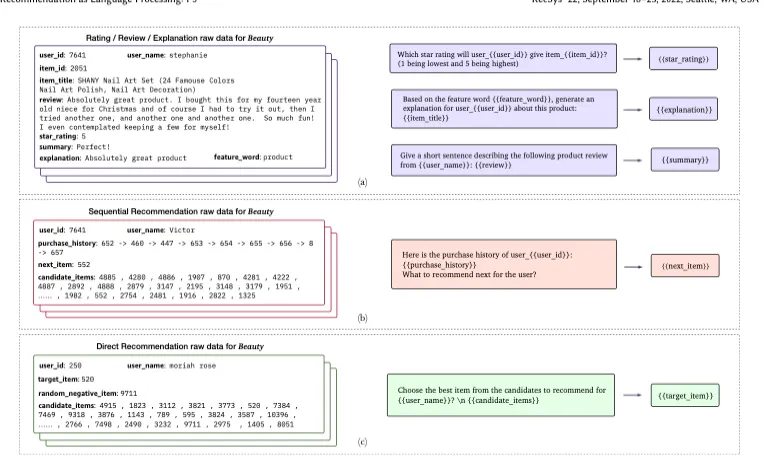 user-item interaction, user descriptions, item metadata, user review들이 전부 common format으로 바뀜 - 자연어 시퀀스