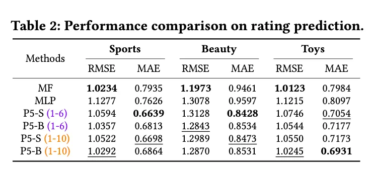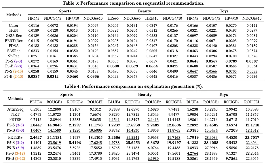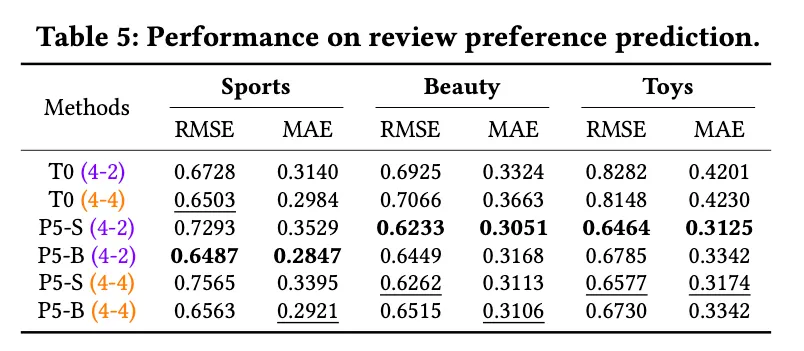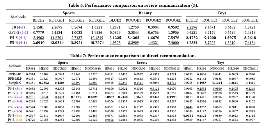 P5는 sufficient zero-shot generalization 능력을 새로운 프롬프트나 새로운 아이템에 대해서도 보여줌