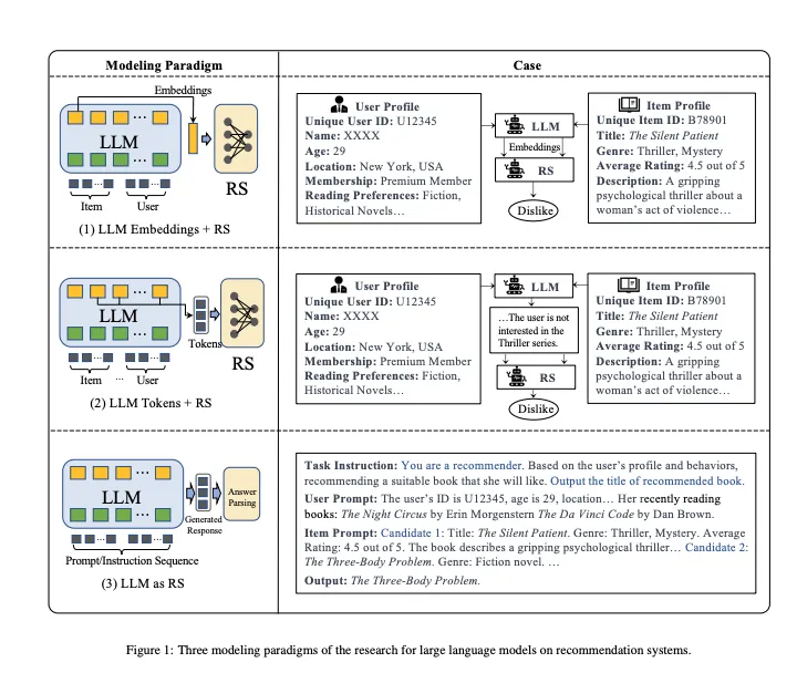 모델링 패러다임 관점에서, LLM 추천 모델의 현재 연구를 세 가지 사고 학파로 분류함