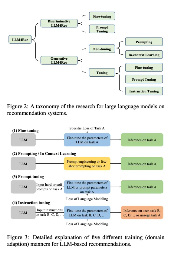 fine-tuning, prompting, prompt tuning, instruction tuning 방식을 LLM based recommendation에서 봄.