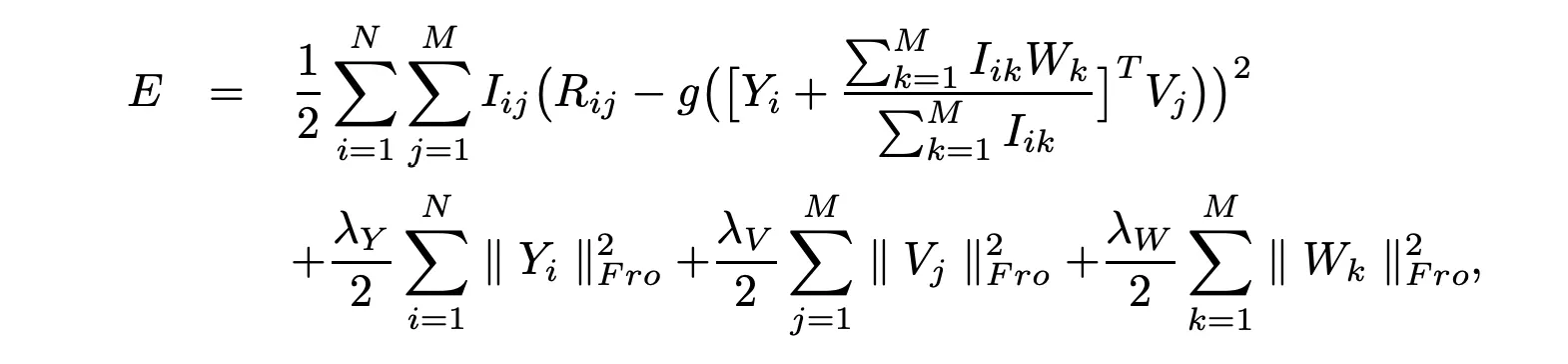 이에, 적은 수의 평점을 남긴 유저는 평점을 남긴 영화를 이용해서 prior를 가정한다. W_k는 학습되는 값이며, latent similarity constraint matrix 이다. W 매트릭스의 i번째 열은 유저가 평점을 남긴 특정한 영화가 해당 유저의 feature vector의 평균에 주는 영향을 잡아낸다.