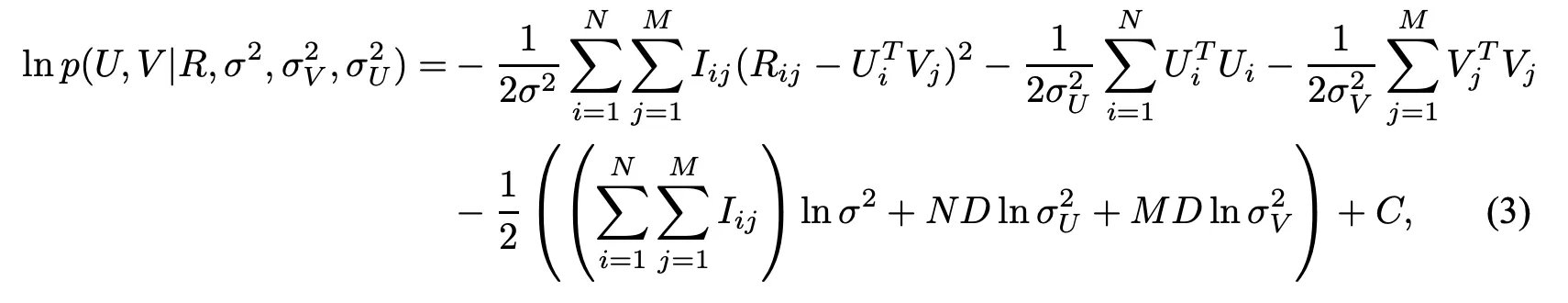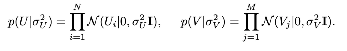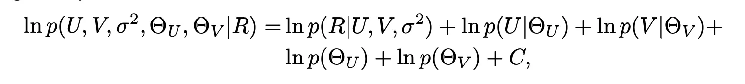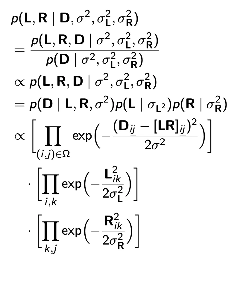 대신에 위에 있는 식에 따르면 L2-norm으로 penalizing을 하는게 곧 MAP를 높이는 방식이라고 바라 볼 수 있다. 각 lambda는 U,V에 대한 Sigma로 조절이 되는 값들이다. 따라서 이런 hyperparameter에 대한 prior를 도입해서 모델 complexity를 자동으로 조절할 수 있게끔 한다.