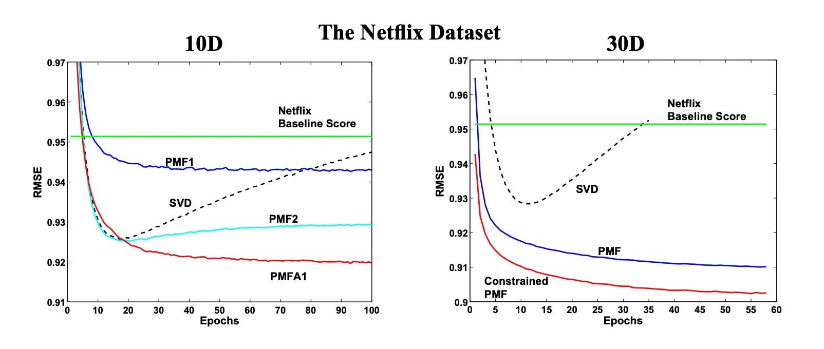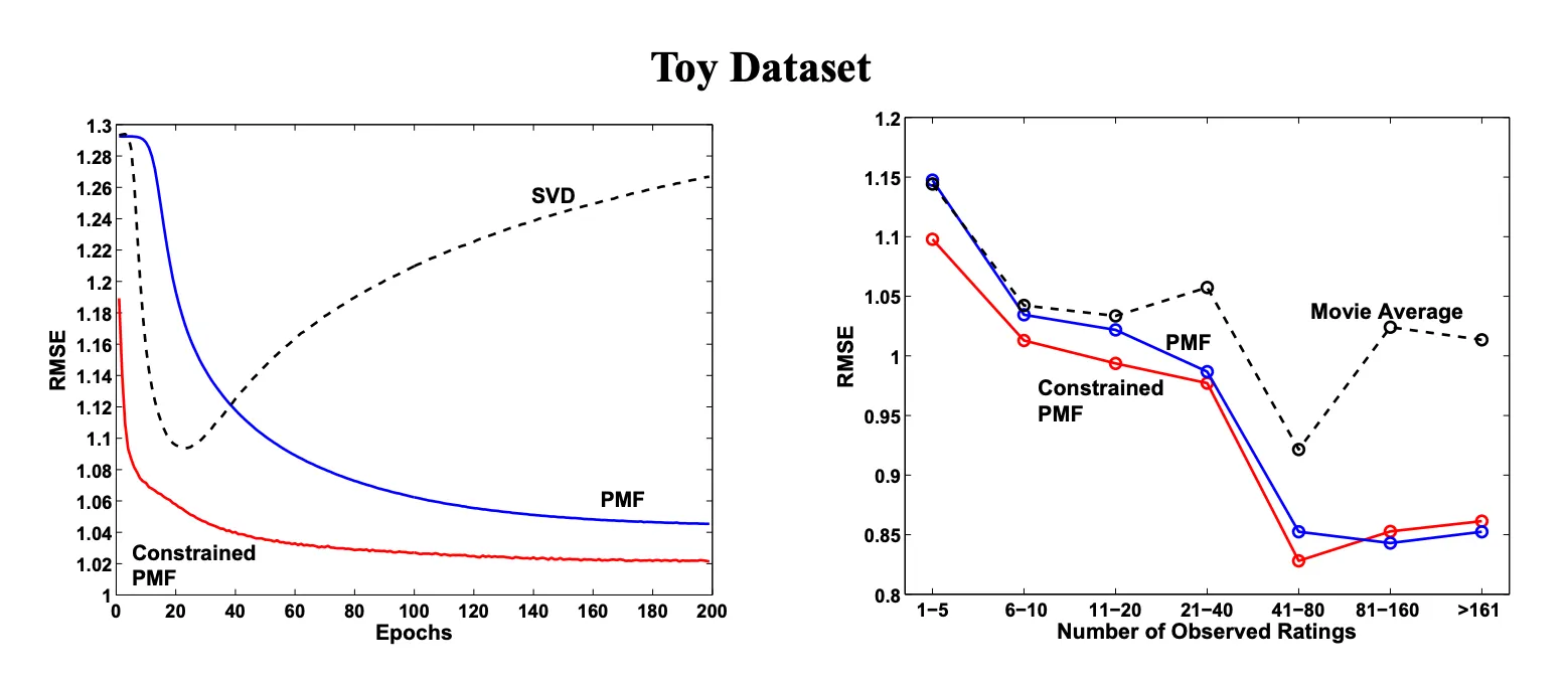 기록한 평점의 수가 20개 미만일 때는 constrained PMF가 더 좋은 성능을 보이다가 그 이상이 되면 큰 차이를 안 보임.