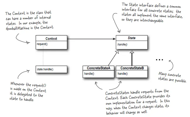 State 인터페이스에서는 모든 구상 상태 클래스에 대한 공통 인터페이스를 정의.