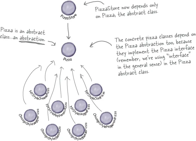 원래는 고수준 구성요소가 저수준 구성요소에 전부 의존하지만, 의존성 뒤집기 원칙에 의하면 고수준 구성요소인 PizzaStore와 저수준 구성요소인 피자 객체들이 모두 추상 클래스인 Pizza에 의존한다.