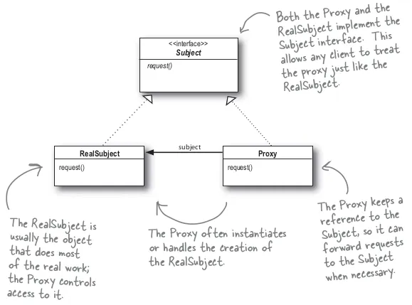 Proxy에는 실제 작업을 처리하는 객체에 대한 레퍼런스가 들어있다. 실제 객체가 필요하면 그 레퍼런스를 이용해서 요청을 전달한다.