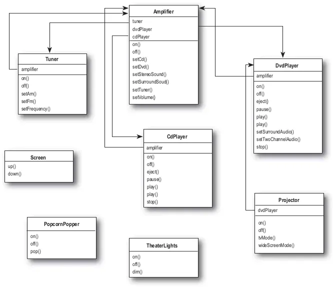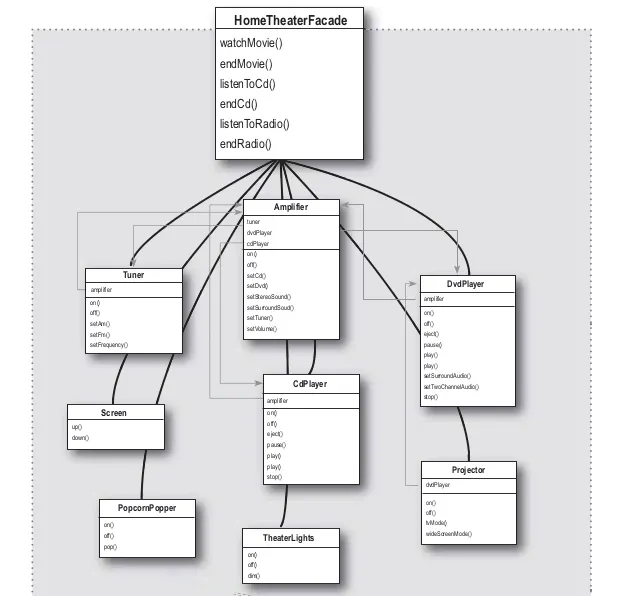 따라서 퍼사드 패턴을 써서, 홈씨어터에 대한 인터페이스를 재정의한다.