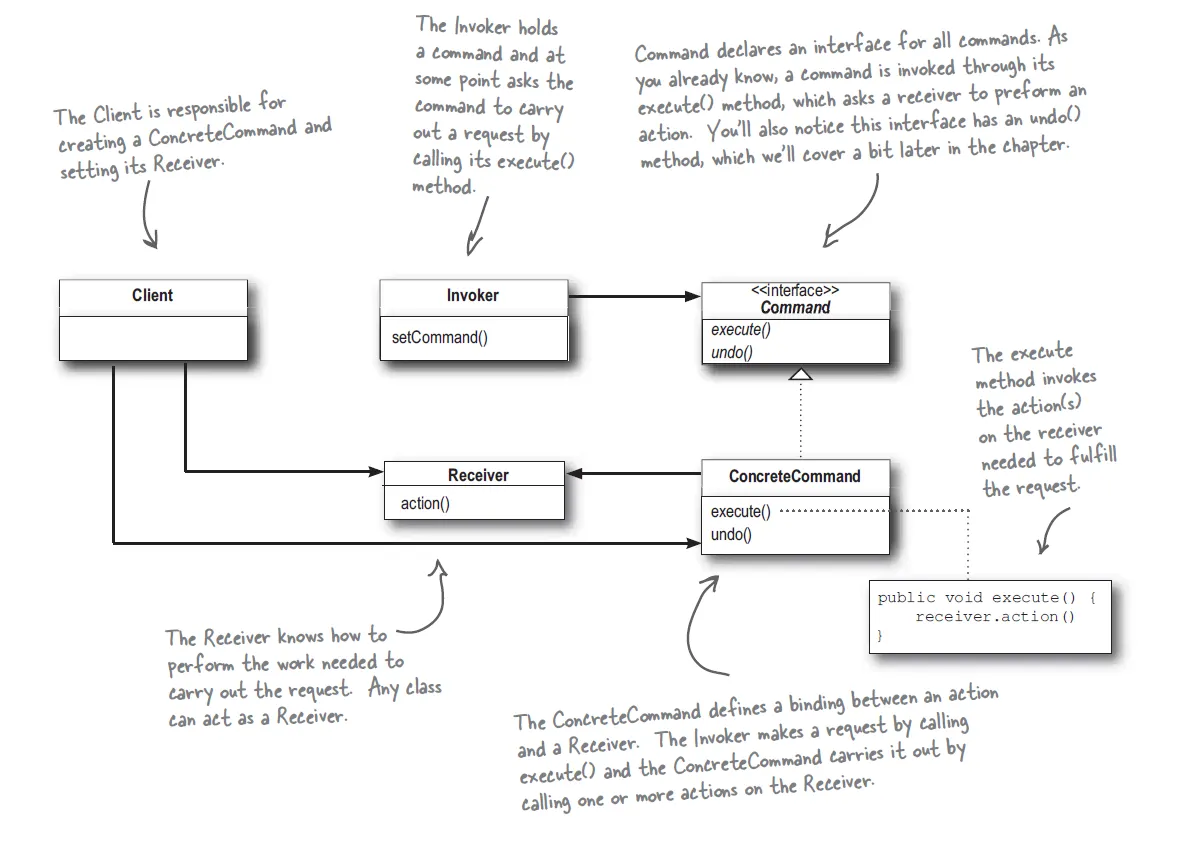 → 각 버튼마다 커맨드 객체를 저장해두면 사용자가 버튼을 눌렀을 때, 커맨드 객체를 통해 작업을 처리하도록 만든다. 리모컨에서는 전혀 자세한 내용을 몰라도 된다.