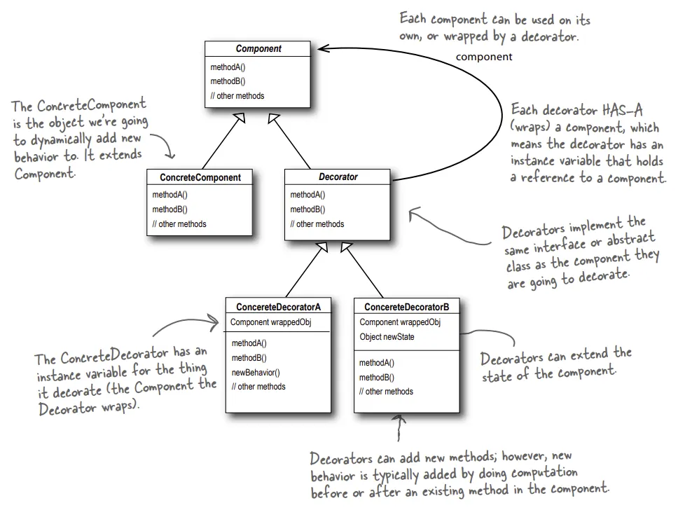 원래 객체가 들어가는 자리에 자기자신을 넣어도 된다. 자신이 장식하는 객체에게 어떤 행동을 위임하는 것외 추가적인 작업을 수행.