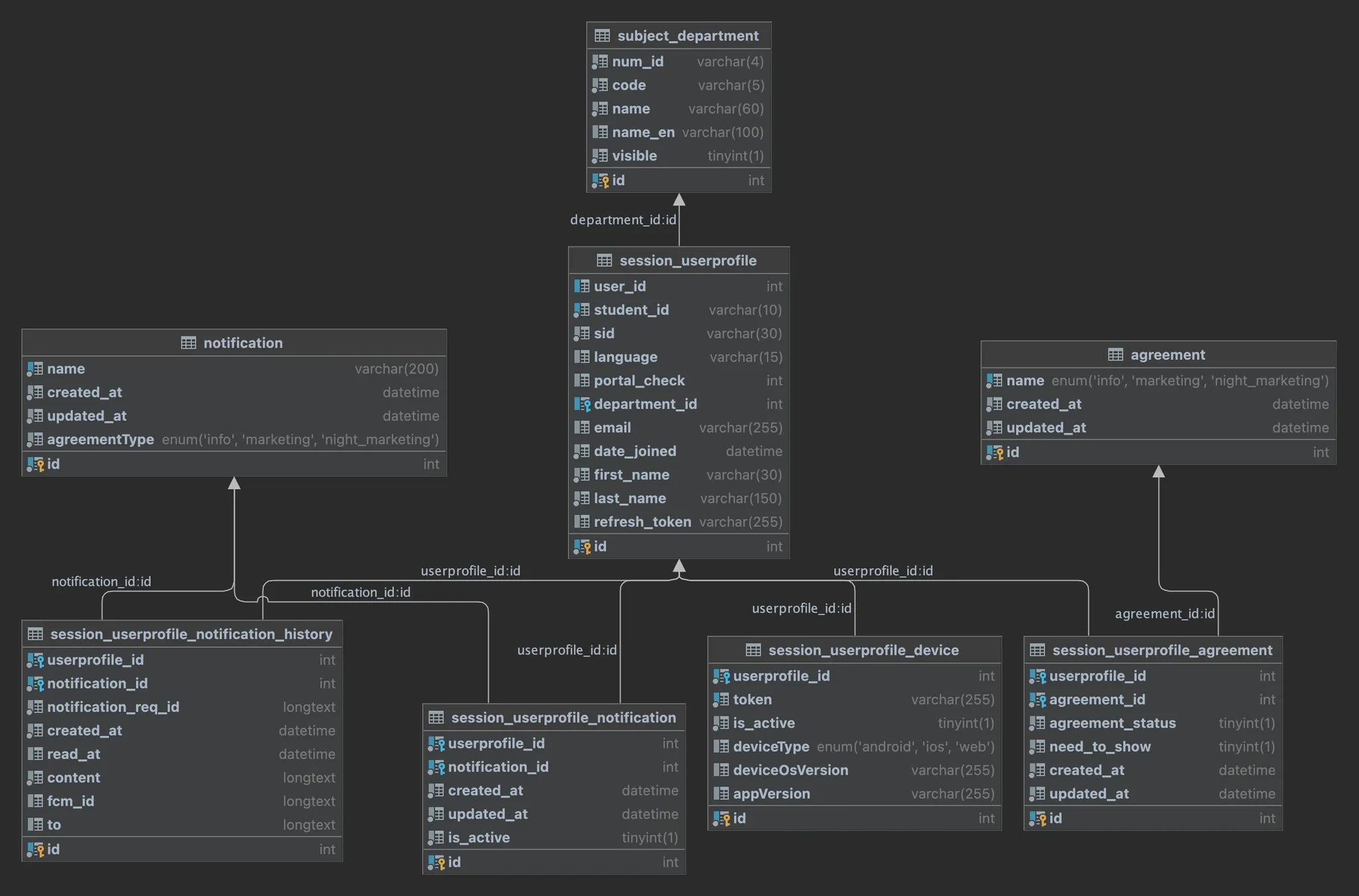 따라서 위와 같이 agreement에도 agreement_status를 넣고, session_userprofile_notification에도 is_active를 넣었습니다.