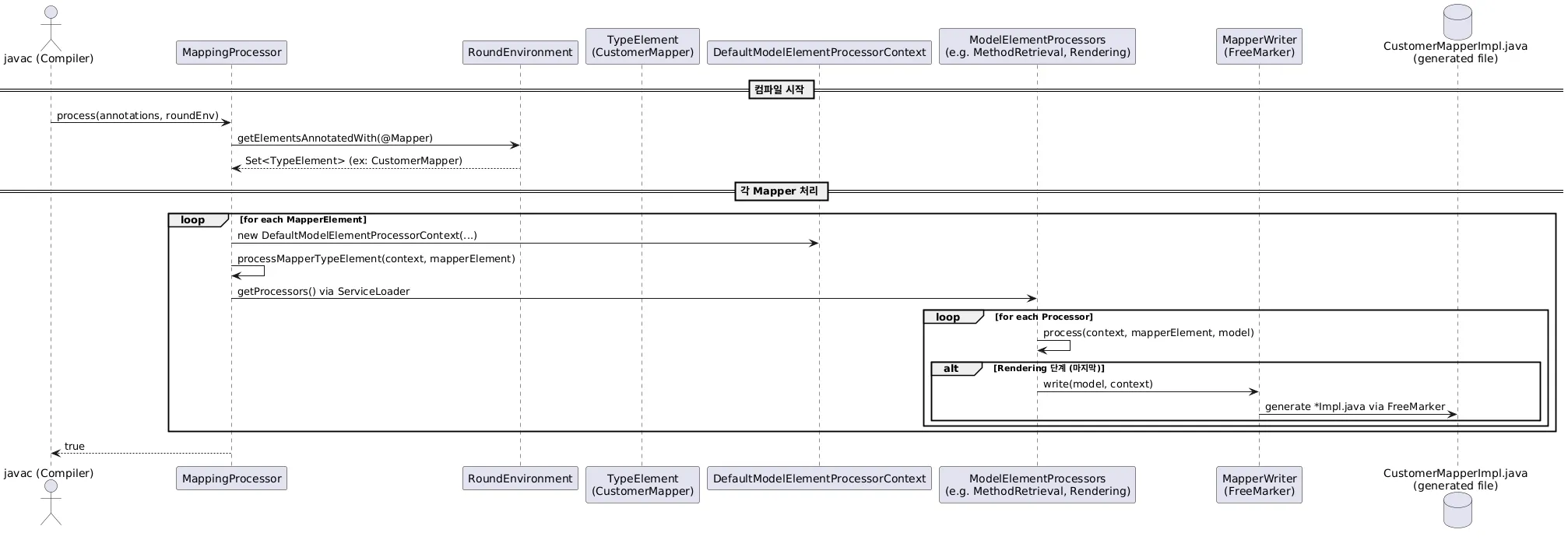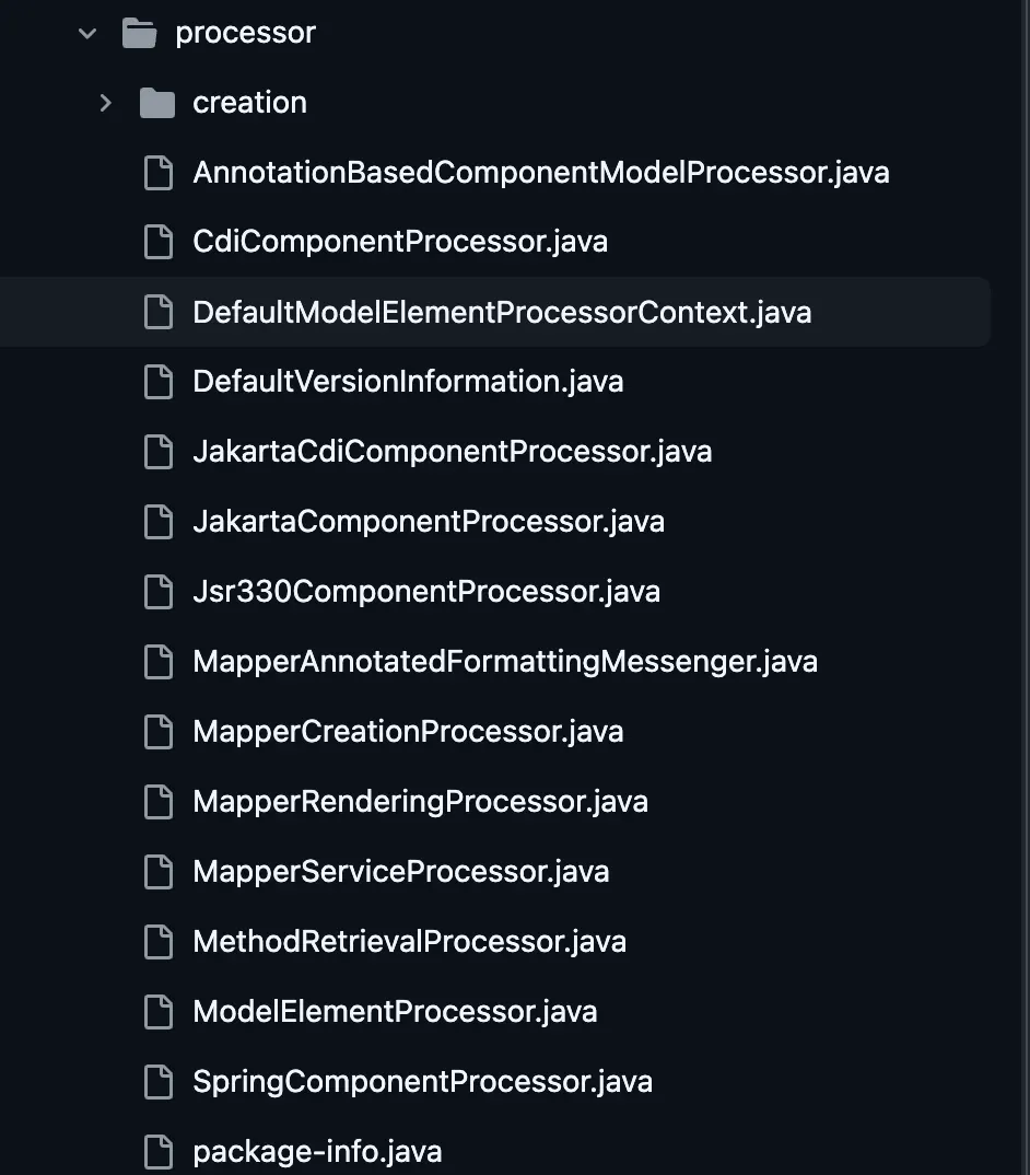 아무래도 MapStruct를 사용하는 방법이 여러개이다 보니 그에 맞는 processor를 선택해서 구현을 하는 것 같습니다. 가장 기본적인 Annotation 기반 구현부터 Injection을 처리하는 Processor도 있는 것으로 보이고, MapperRenderingProcessor는 실제로 File을 만드는 Processor 이며 Mapper에 관한 정보를 모든 담는 mapperCreationProcessor도 있습니다.