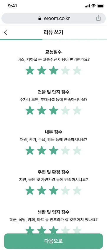 E-room 서비스는 리뷰를 텍스트로도 쓸 수 있지만, Category 별로 ‘좋은 점’과 ‘싫은 점’을 나누어서 태깅할 수도 있고, 별점을 메길 수도 있습니다.