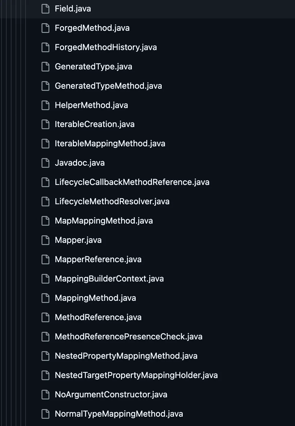 뿐만 아니라 mapstruct는 자체적으로 Class를 만들기 위해 필요한 요소들을 구현하고 있는데 이는 모두 ModelElement라는 abstract class를 구현합니다.